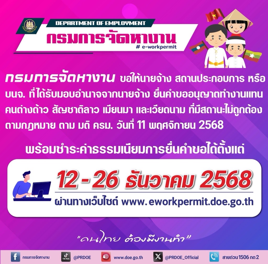 การยื่นคำขออนุญาตทำงานของแรงงานข้ามชาติที่มีสถานะไม่ถูกต้องตามกฎหมาย Facebook iconFacebookTwitter iconTwitterLINE iconLine