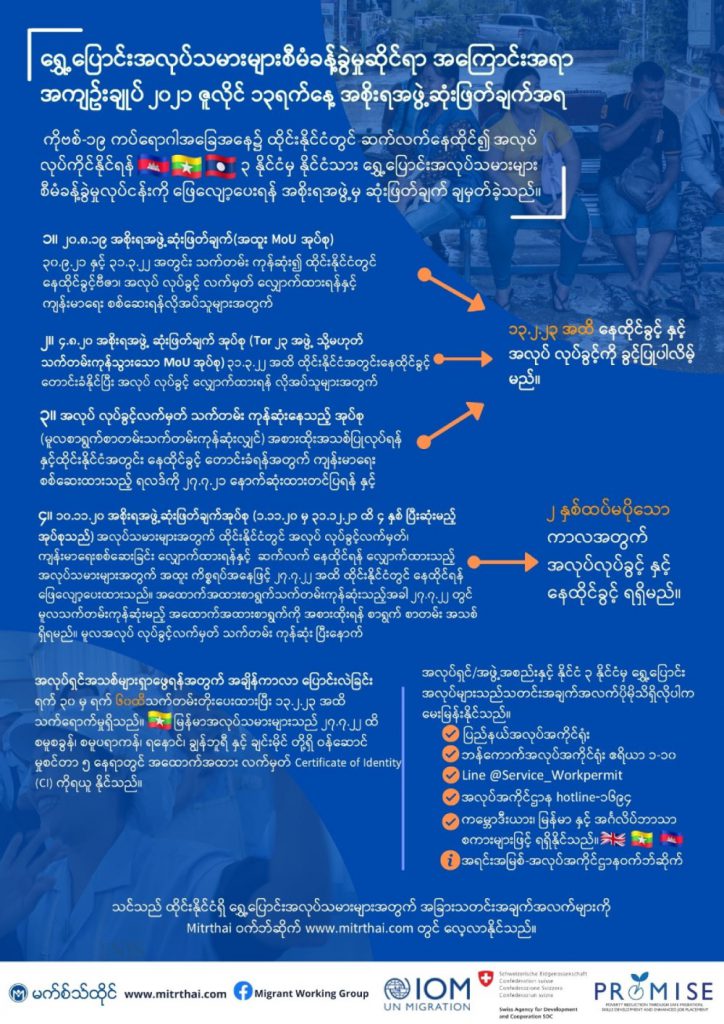ကိုဗစ်-၁၉ ကပ်ရောဂါအခြေအနေ၌ ထိုင်းနိုင်ငံတွင် ဆက်လက်နေထိုင်၍ အလုပ် . လုပ်ကိုင်နိုင်ရန် ၃ နိုင်ငံမှ နိုင်ငံသား ရွှေ့ပြောင်းအလုပ်သမားများ . စီမံခန့်ခွဲမှုလုပ်ငန်းကို ဖြေလျော့ပေးရန် အစိုးရအဖွဲ့မှ ဆုံးဖြတ်ချက် ချမှတ်ခဲ့သည်။ . Facebook iconFacebookTwitter iconTwitterLINE iconLine