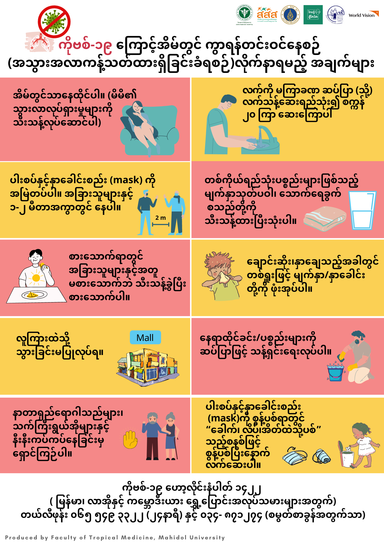 ကိုဗစ်-၁၉ကြောင့်အိမ်တွင်ကွာရန်တင်းဝင်နေစဥ်(အသွားအလာကန့်သတ်ထားရှိခြင်းခံရစဥ်)လိုက်နာရမည့်အချက်များ။ Facebook iconFacebookTwitter iconTwitterLINE iconLine